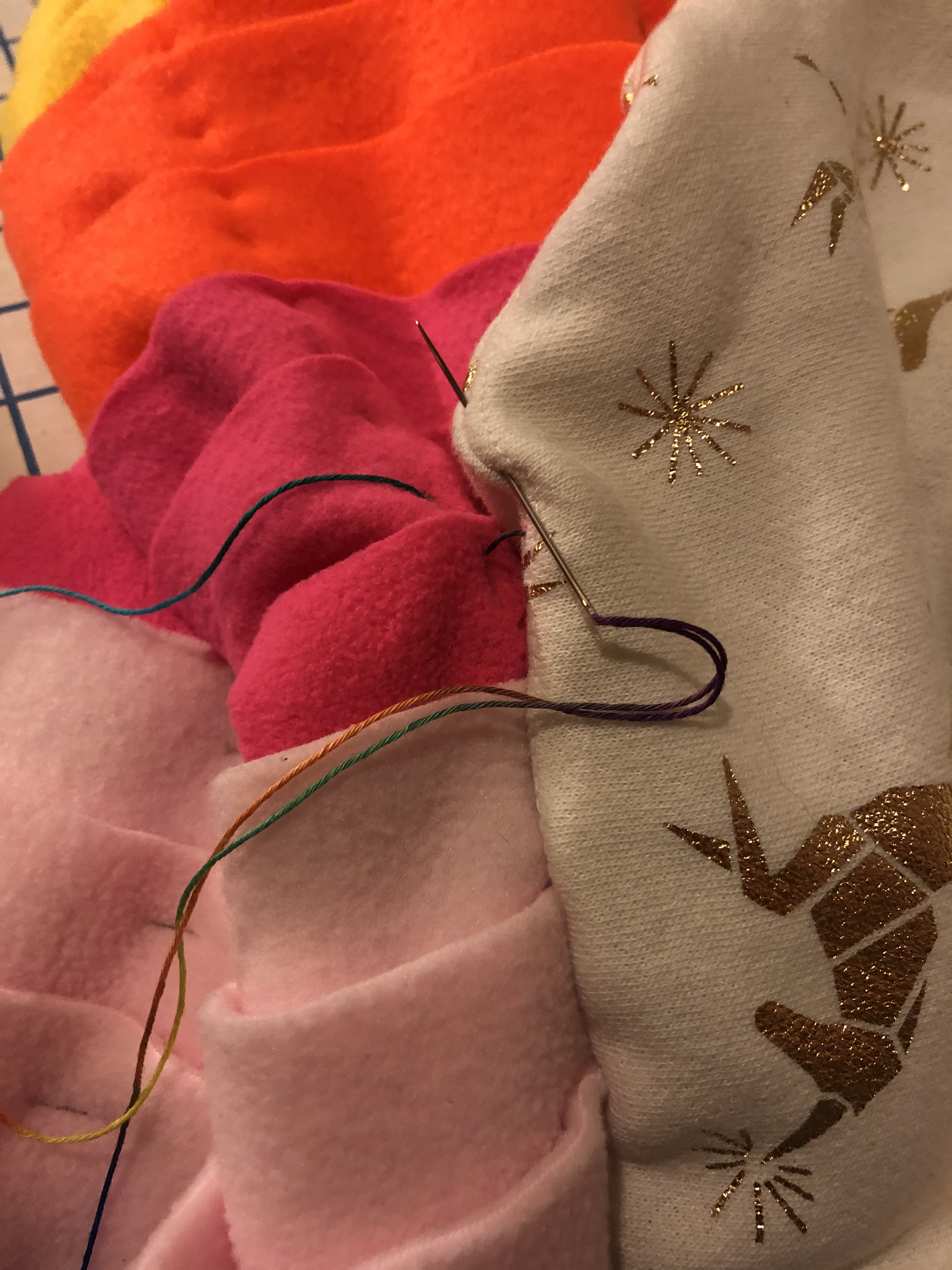 Since I also major in masochism in addition to procrastination, I decide to hand-sew the pieces together instead of using a machine, since it fits my ready-to-run-after-the-baby-at-any-moment lifestyle. I use some super sharp sashiko needles and sashiko thread. They work great! You know what they also are great at? Putting holes in one’s fingers. I highly recommend using these magical inventions called thimbles.
