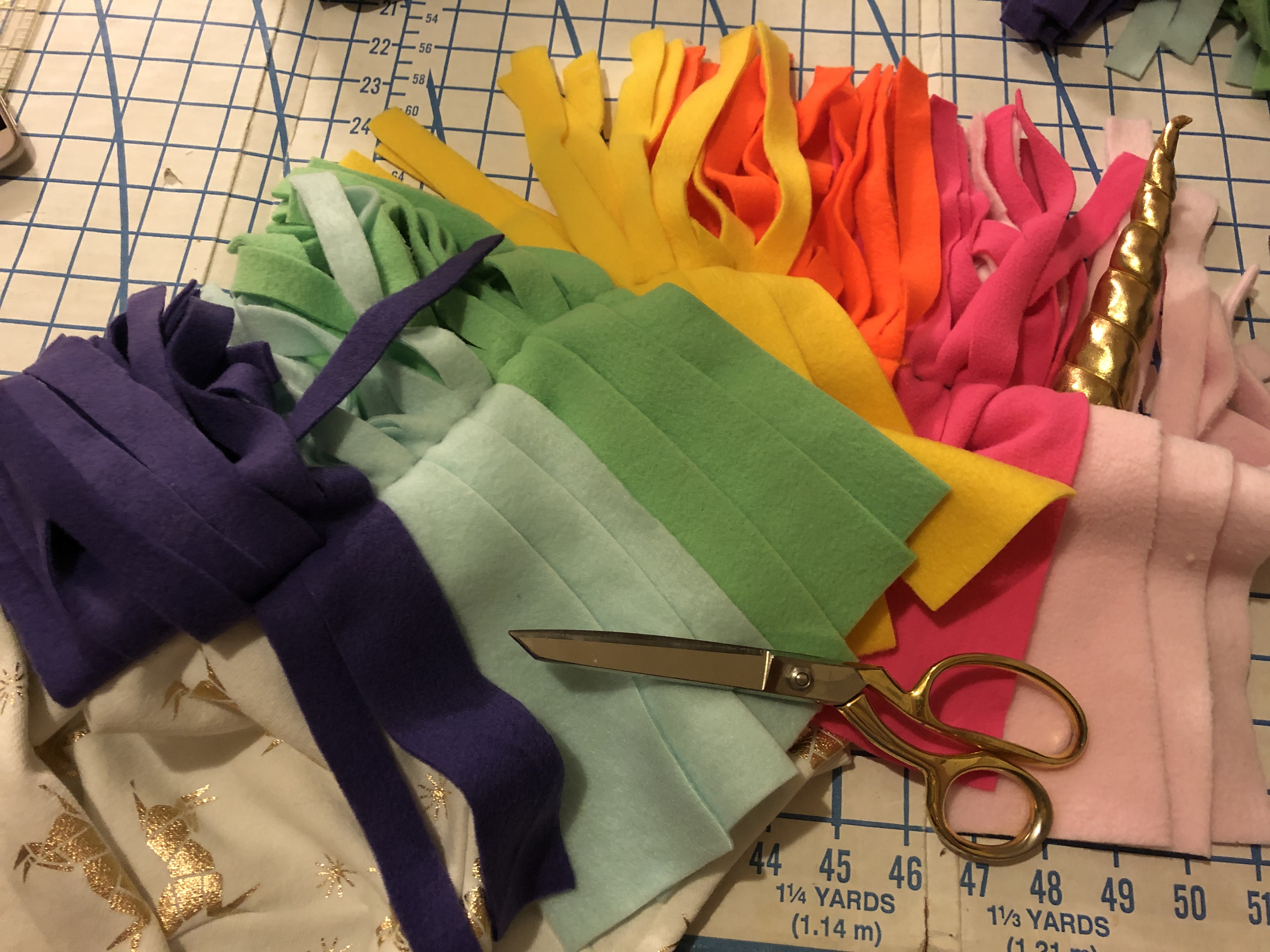 Oh man oh man. This thing is actually starting to come together! I sew on the horn with not a small amount of swearing and proceed to start cutting the mane and tail fleece pieces into smaller strips, up to about a 1/4″ from the stitched lines. This step takes a millennia to finish because I find out my Gingher shears are badly in need of oiling. And sharpening.