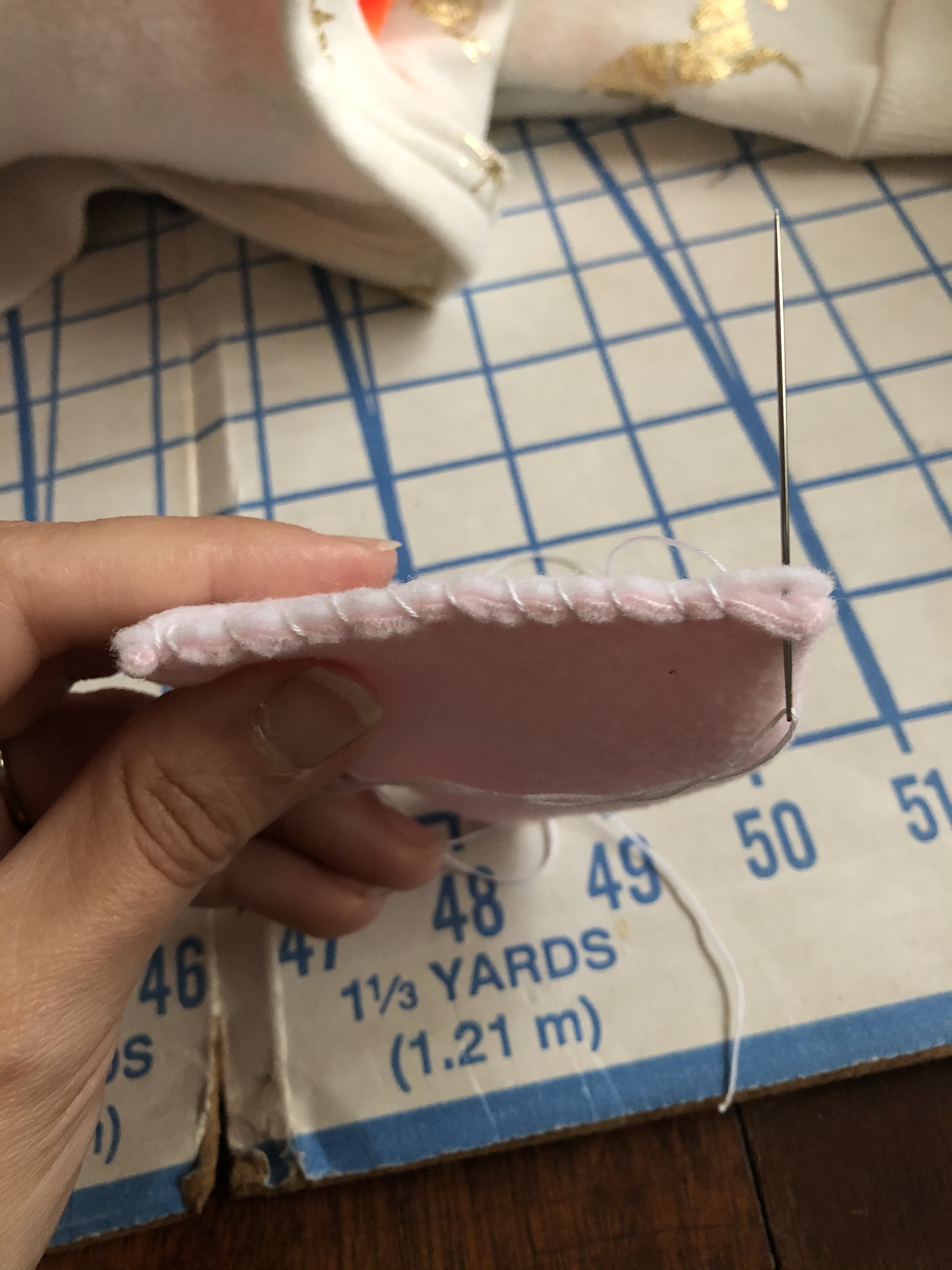 I assemble the ears out of some pink fleece and white felt. Before I sew them onto the hood, I whip-stitch the bottom closed because I like doing extra work.