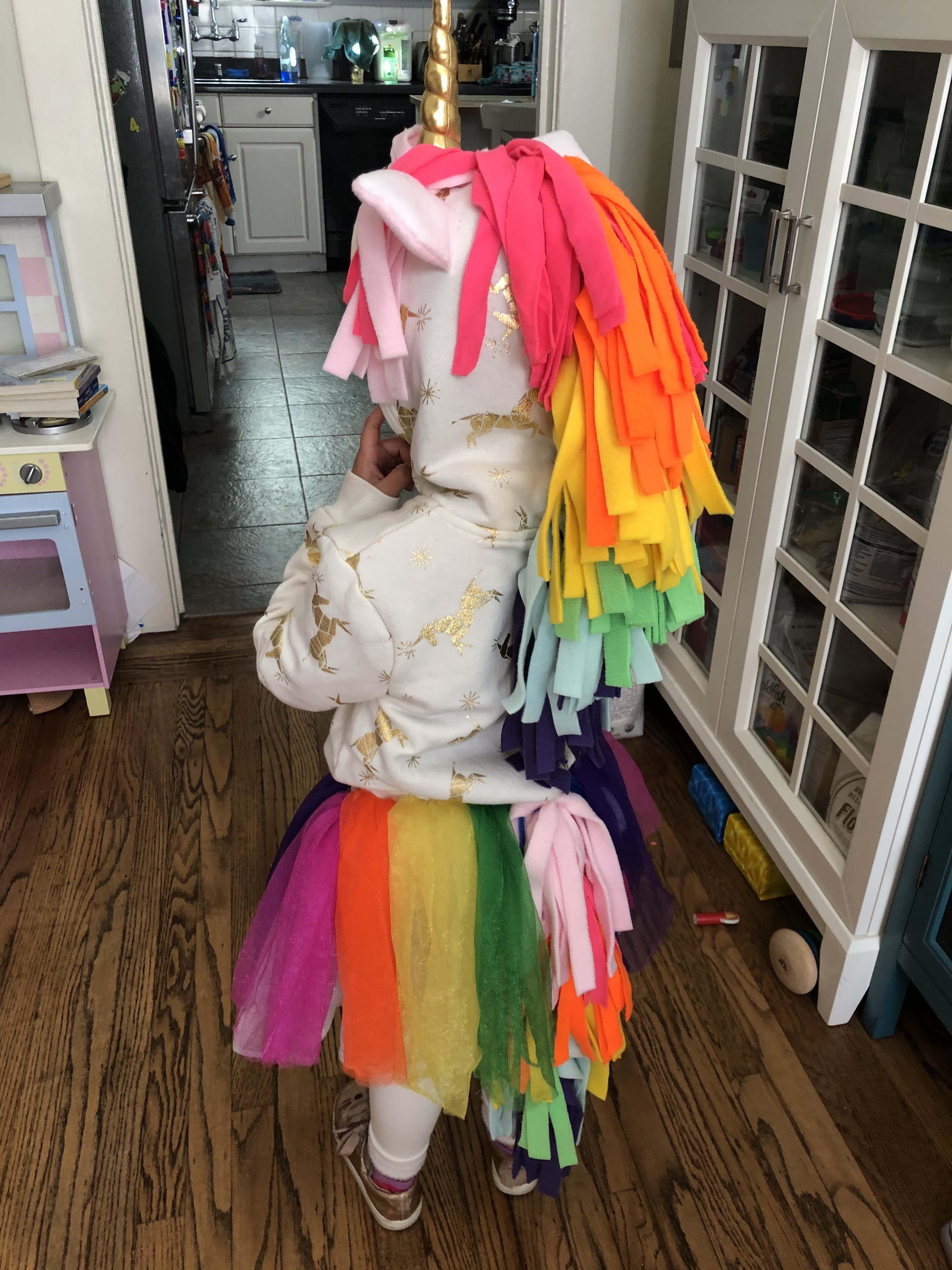 Grandma shows up and we get the unicorn dressed: hoodie with the works, white leggings, a tutu I most definitely did not make because tulle, and pink sparkly shoes because my child. Grandma and kiddo head out.