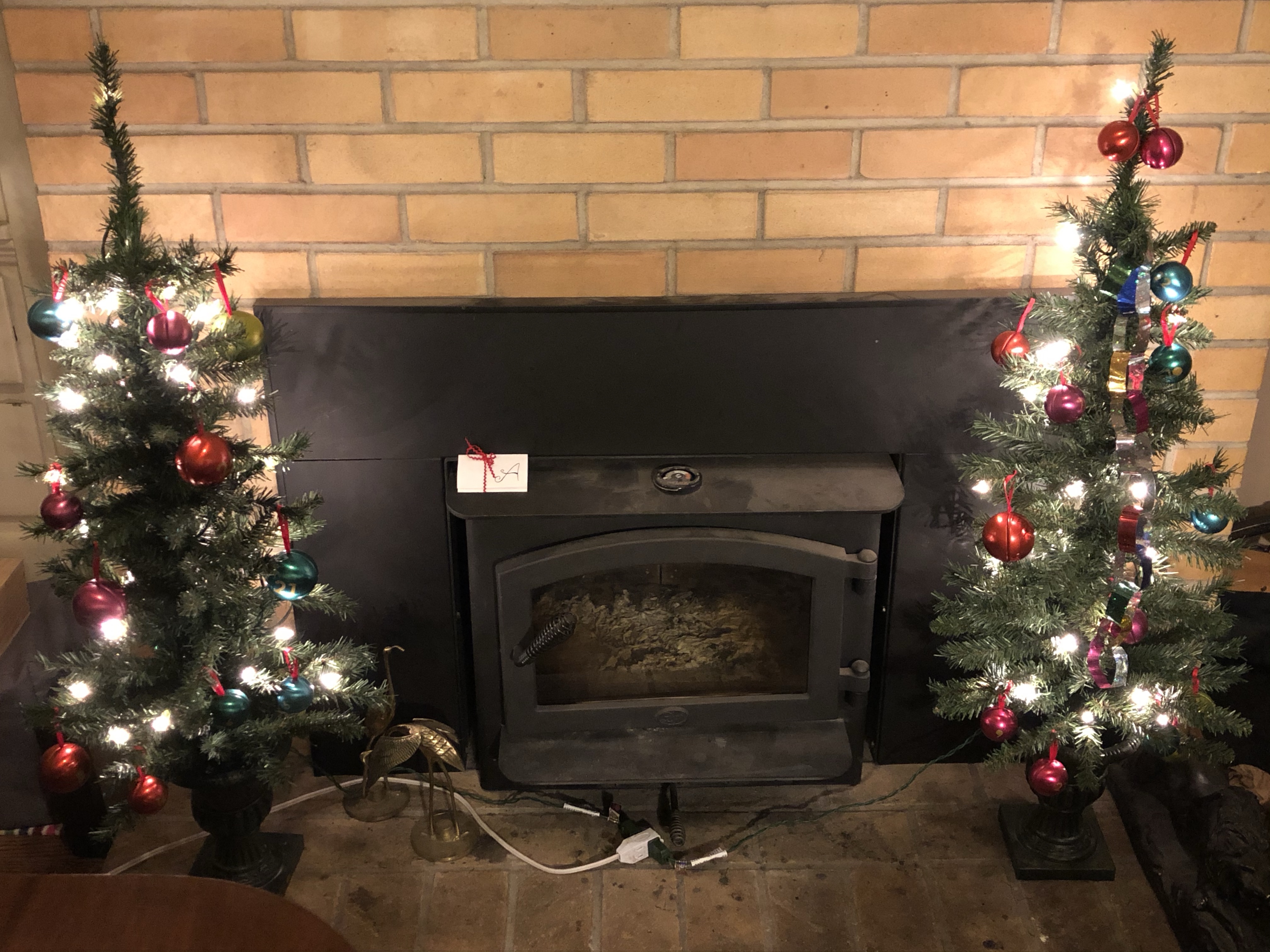 First order of business: I need to find a vessel for these “bonbons d’Advent” (that could be right, I don’t know. I don’t speak French, I just play one on TV). AHA! My mom gave me these numbered ornaments years ago, and I have these little fake trees with lights and i also have a fireplace… et voila!