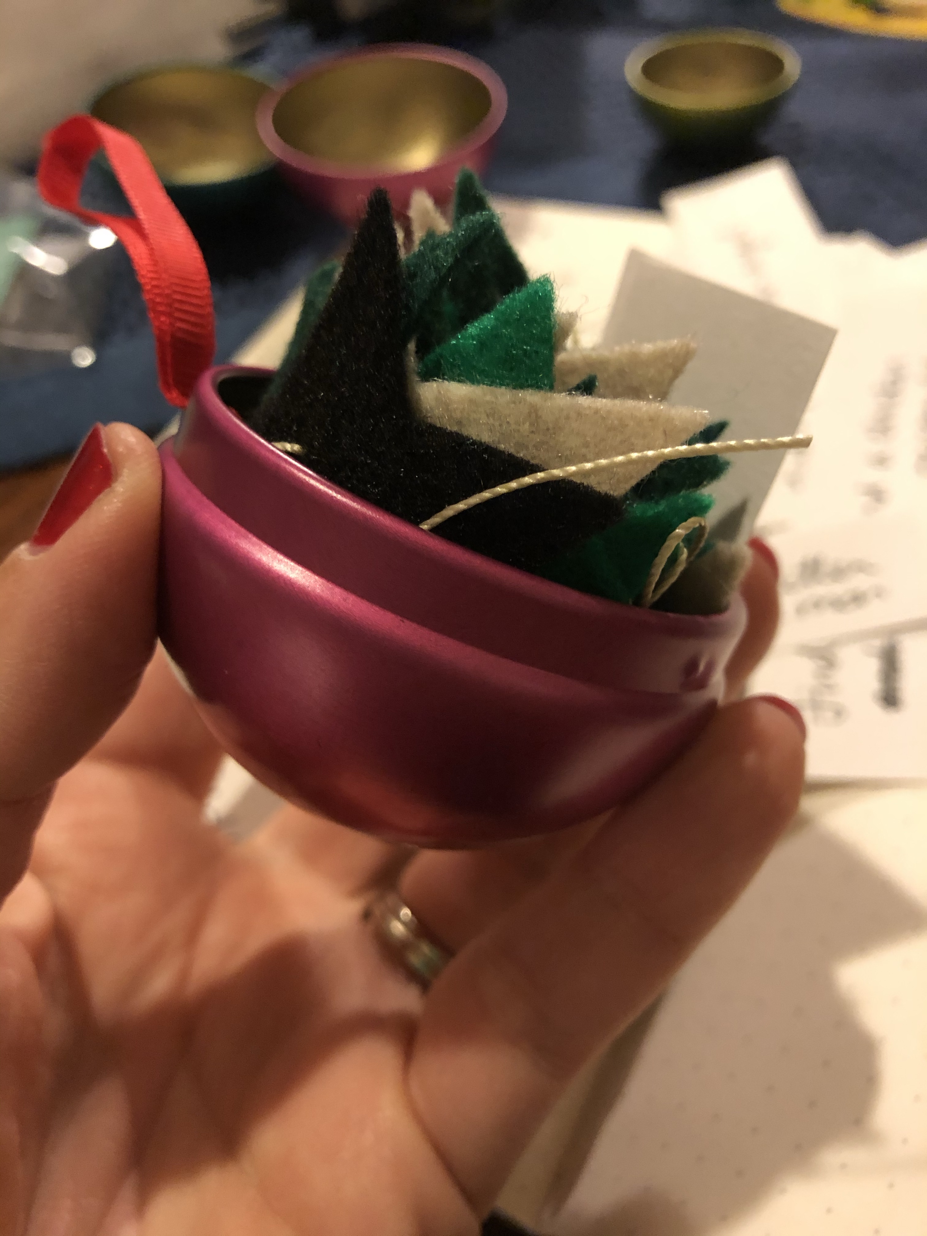 Now, what to put inside? Some of the ornaments are large, but most are small. *Googles advent ideas with the speed of Santa’s reindeer* After a brief consultation of Google image results, I decide to write little things to do on pieces of paper, put them in each ornament, and some will have added goodies. No prob, Bob.