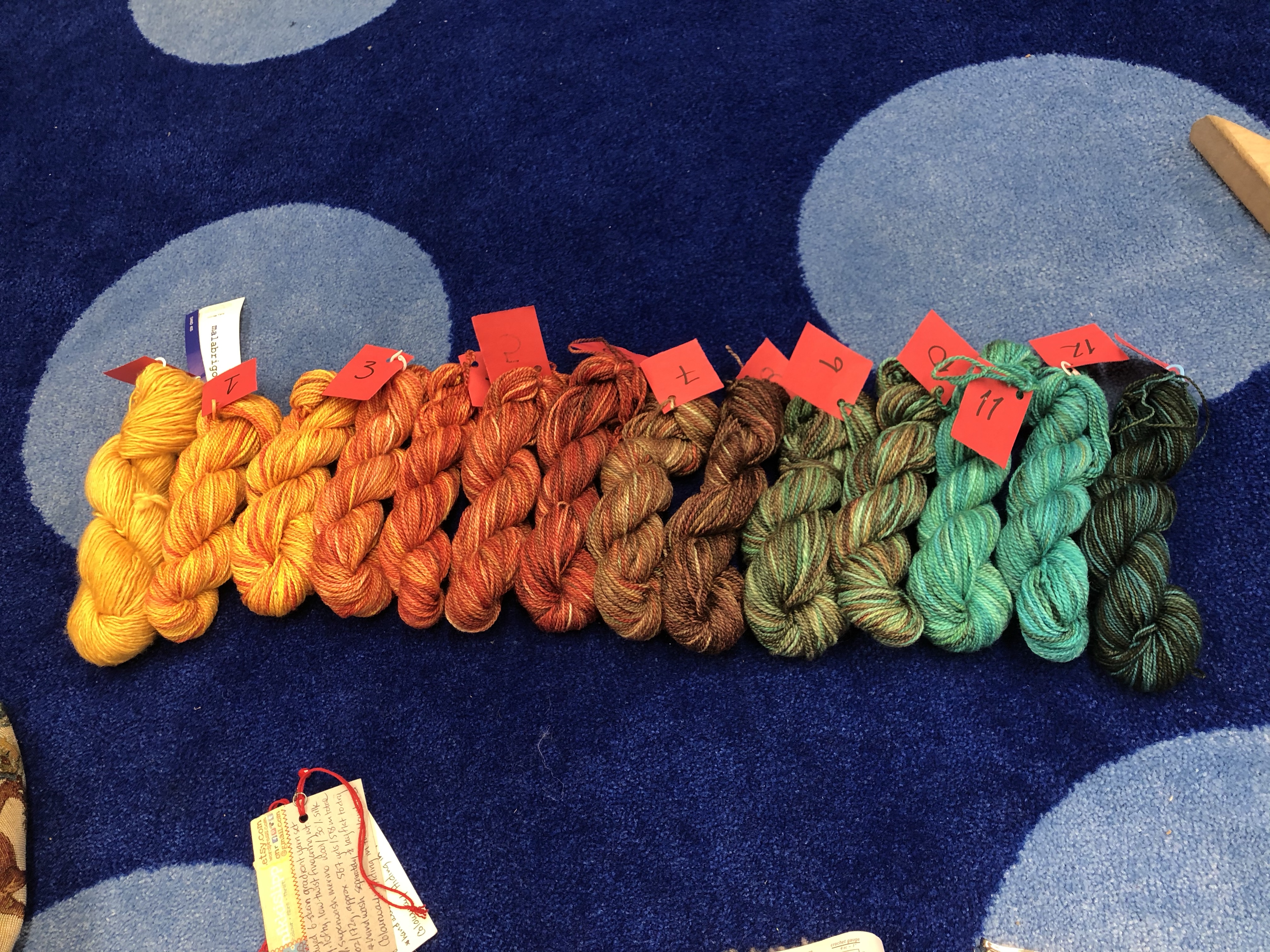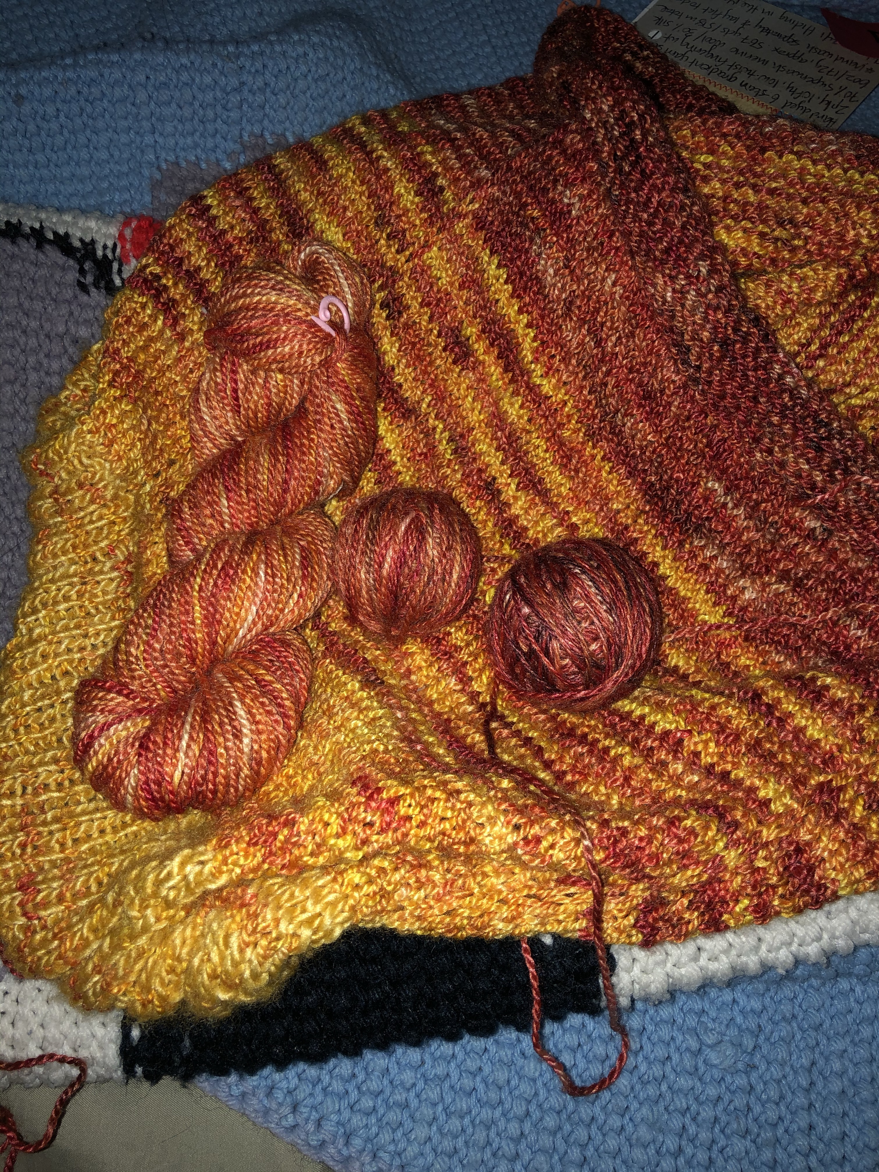 Fast forward to yesterday. I’m looking through the bag of yarn for the next darker hue, and I find it. A skein of YELLOW ORANGE.