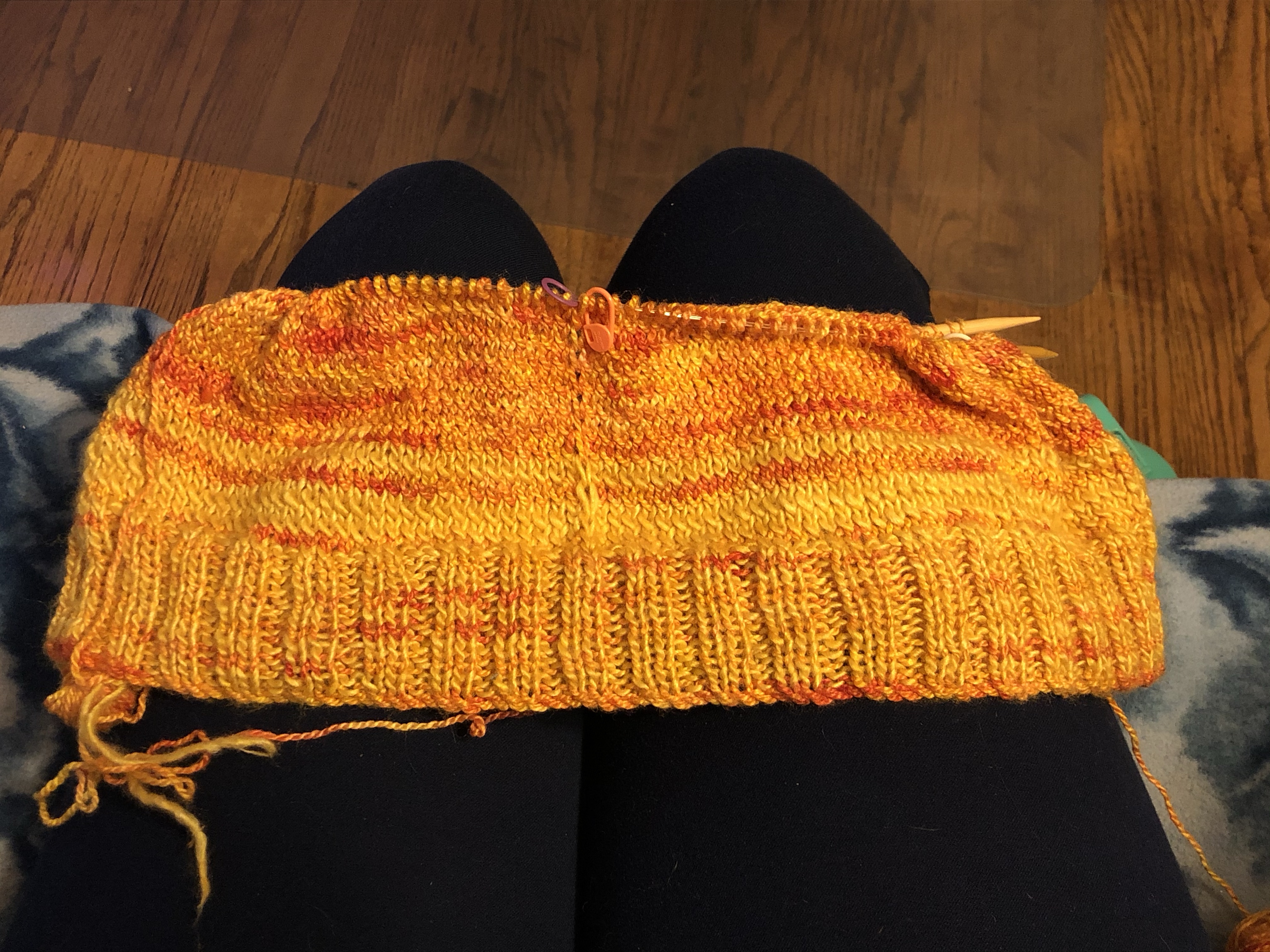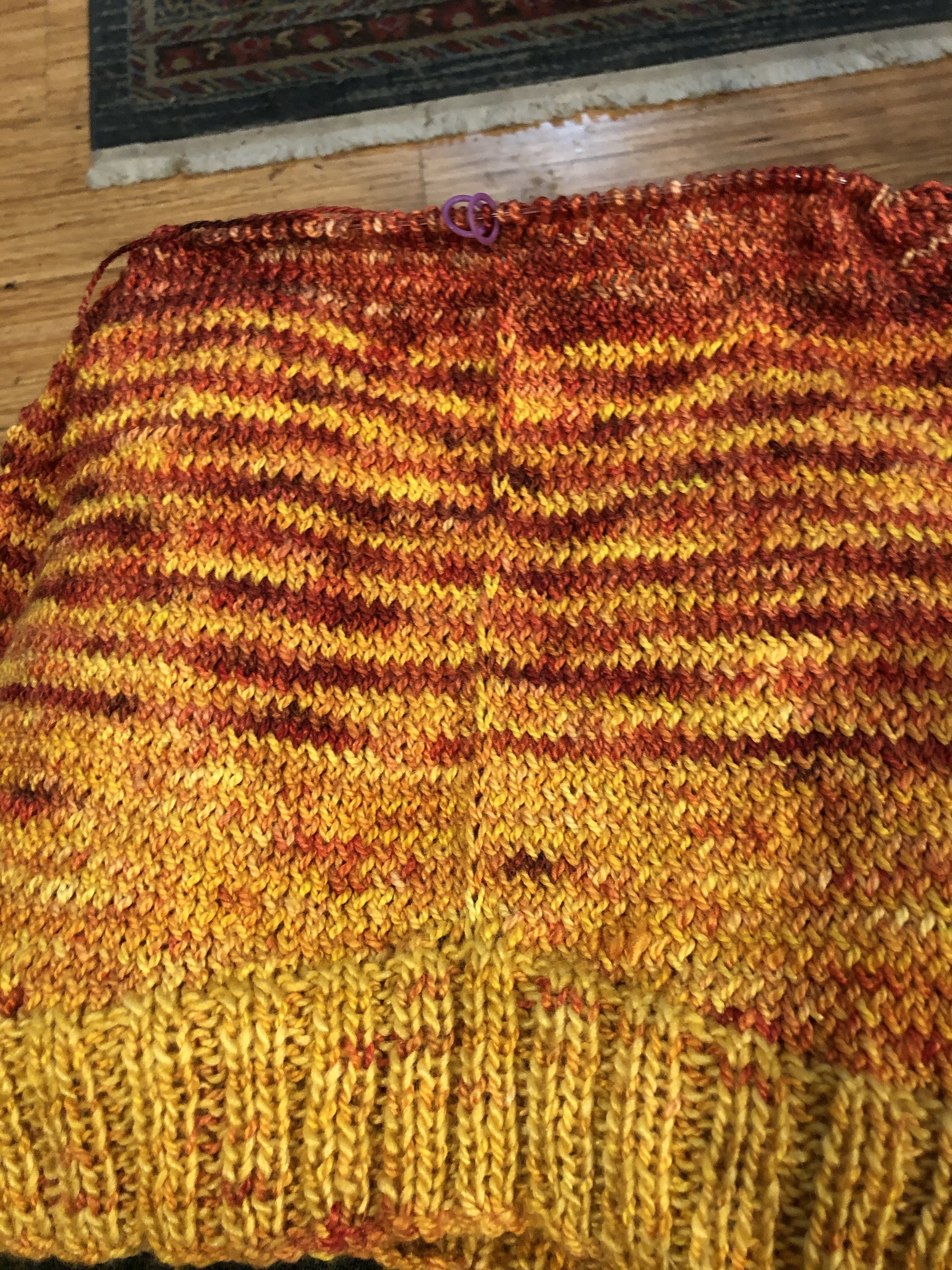Anyway, I get this thing going. I royally mess up the alternating rows of knitting stockinette and through the back loop through the short row portion, but whatever, it’s on my butt and as a dear creative mentor told me once “If someone is close enough to notice that mistake, they better be family or someone you like.” I am working two colors at once, and I’m pleased with the result. I move on and start the next colors. And the next colors.