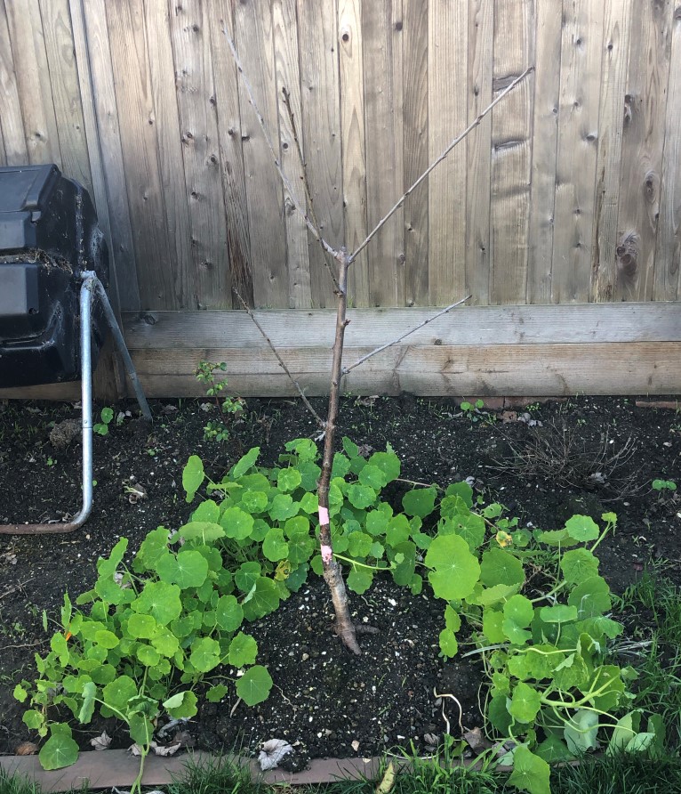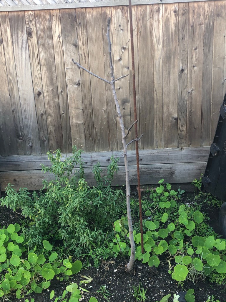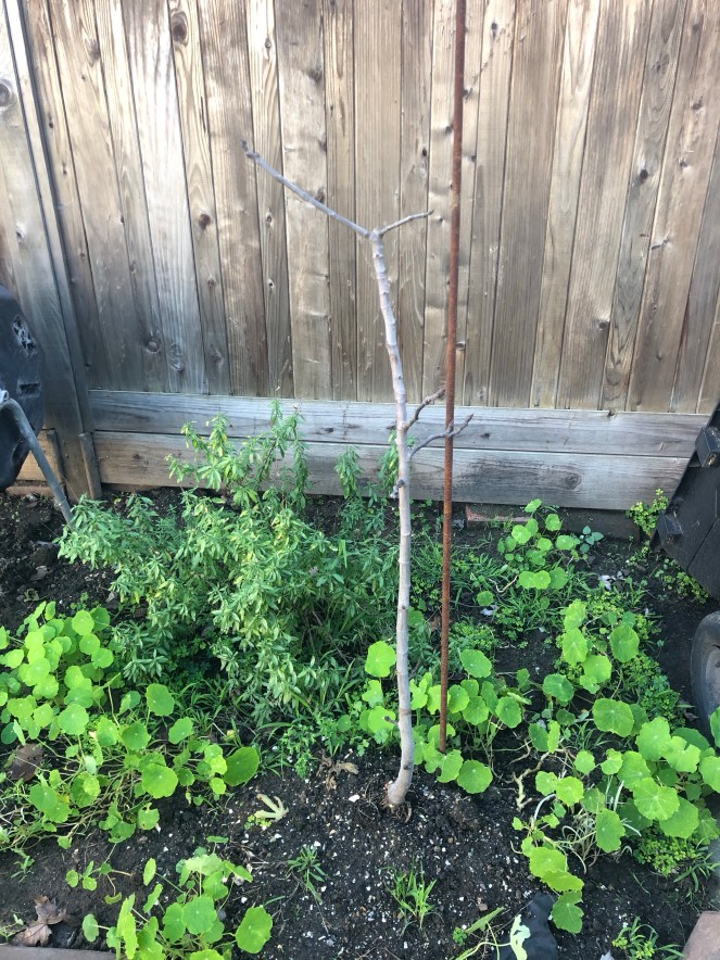 Last but not least, the fig! This one is also a baby, and very, very leggy. It sort of looks like an overly long twig I stuck in the ground but it is in fact alive, I assure you.