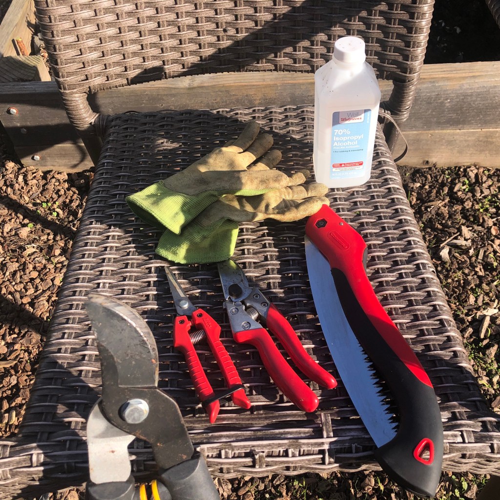 I recommend having at least pruning shears and a saw for this work. The nippers and the loppers (smallest and largest of the tools pictured) are handy, but not essential. I also highly recommend having rubbing alcohol on hand to sanitize your blades between trees. There are a surprising amount of diseases that can be transmitted from tree to tree during pruning. Ask me how I know (RIP apple, peach, and cherry trees, we barely knew ye).