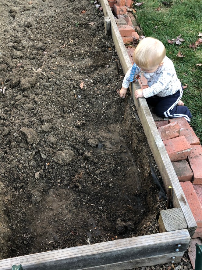 Three afternoons later, not even close to consecutive because life and weather, I finally get the bed mostly empty. I’ve left the two lavenders alone and everything else came OUT; summarily distributed somewhere else in the yard where I don’t have to dig regularly. The babe even “helped” one afternoon.