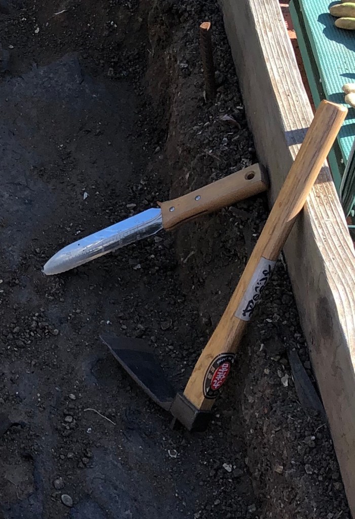 First I try to use a standard hoe to break up the obnoxious clay clods, but it’s so long that I’m overly wary of accidentally clipping the wood sides. Next I try the shovel, but the angles are all wrong. So I get out my Precious: my bachi hand hoe.