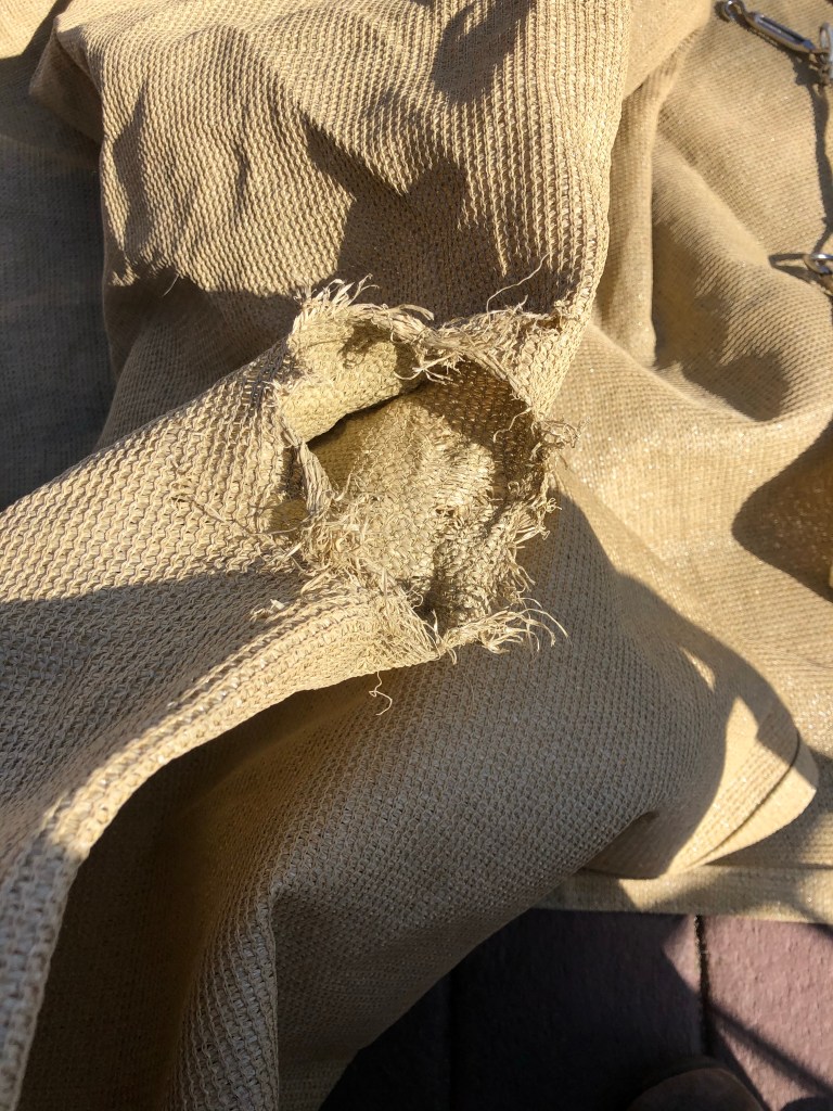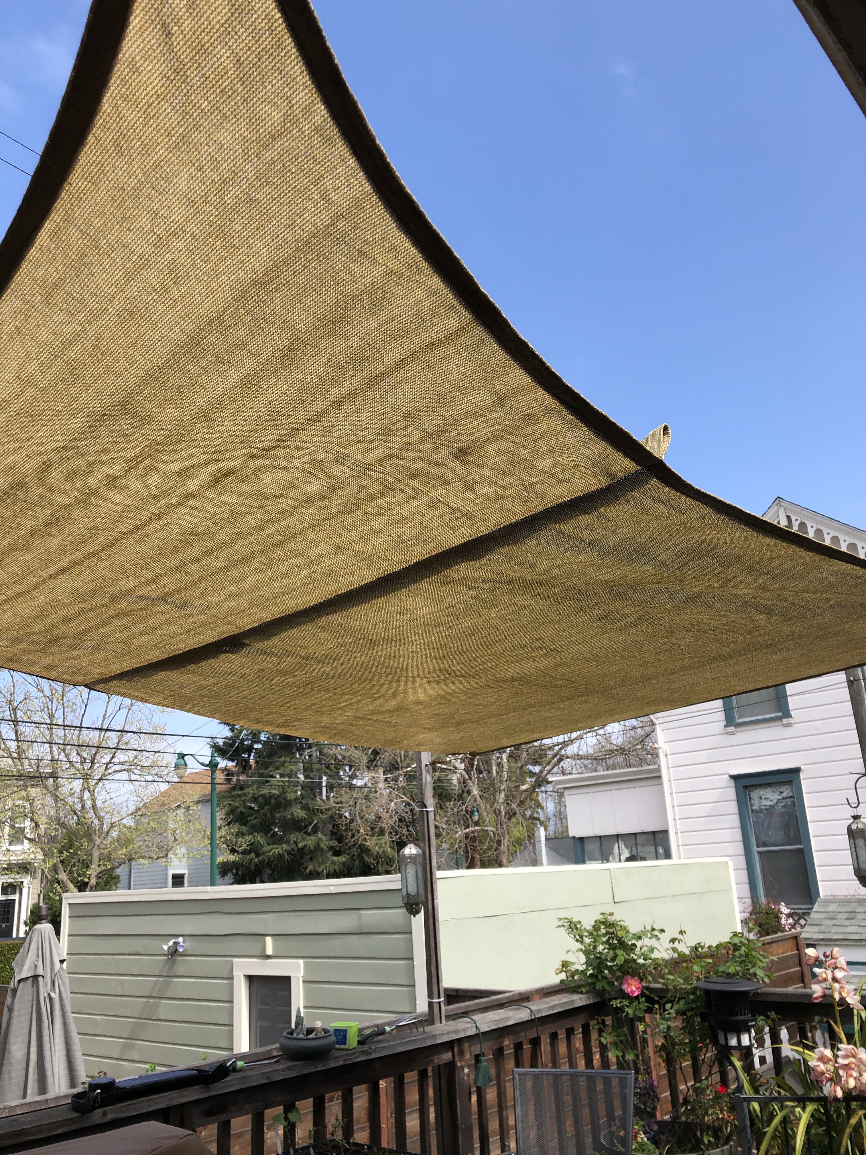 We took it down during a recent windy day, as it’s alternate name of “sun sail” is pretty apt in a windstorm. I was worried the force of it catching the 45+ mph gusts was going to result in something breaking off of our deck or house. My partner and I unhooked it and stashed it on the deck under a table, like you do. Or at least we do, because we were going to put it up after the winds had died down.