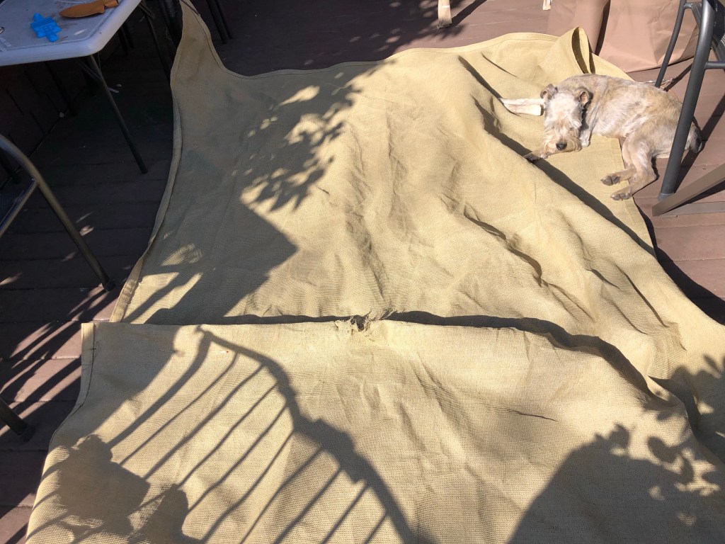 On a day when the kids are at their grandparents, I lay the sunshade sun-side up on the deck. I try to get as flat as I can, and insist the dog lie down on a corner of it and not exactly where I’m trying to work. I take the material on either side of the hole and pin the two sides together across the entire width of the sunshade. Now, to sew it!