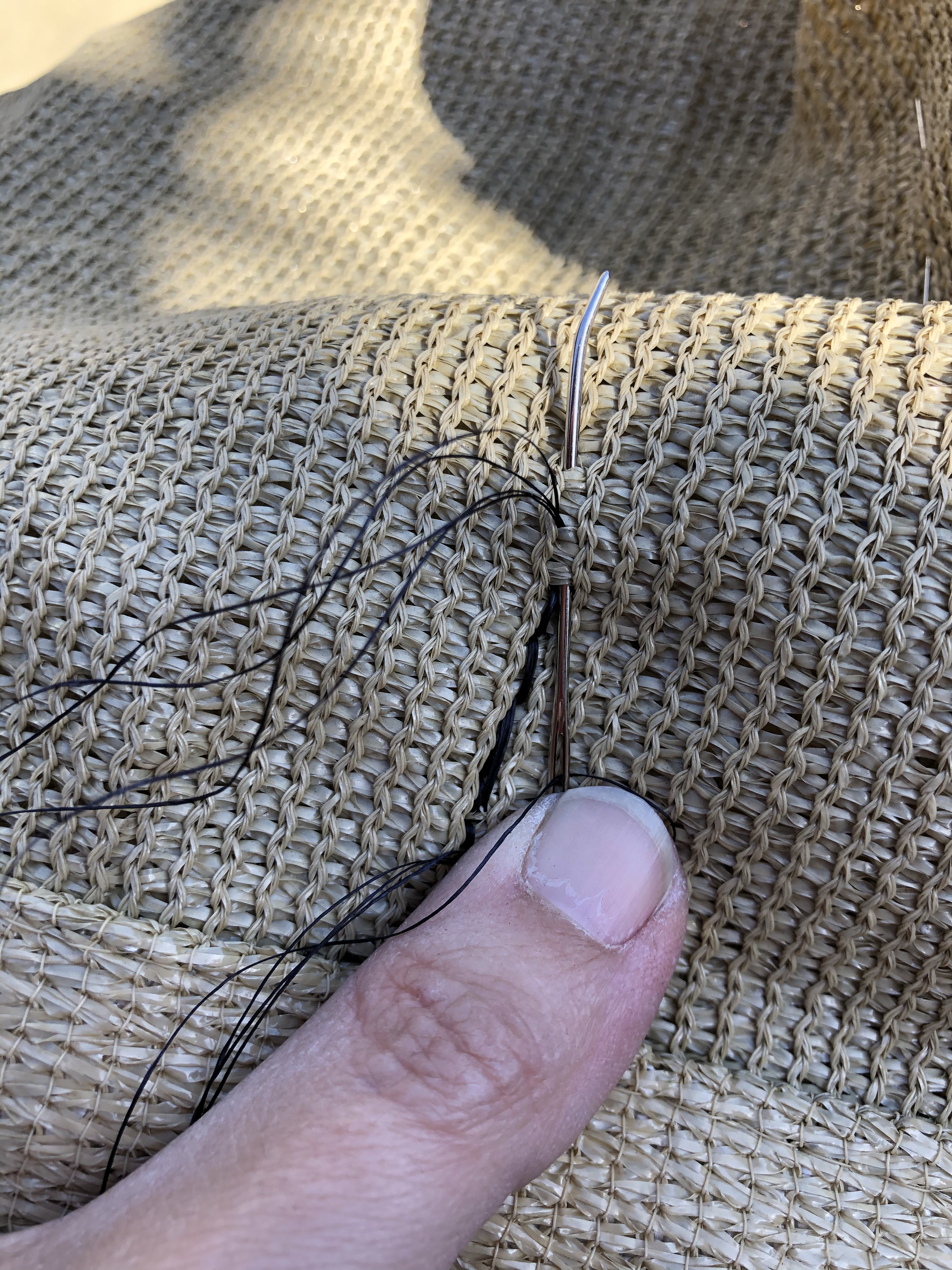 Sewing it was actually much easier going once I got into the rhythm. I used my trusty bent-tip weaving needle and some durable thread. I quadrupled the thread because Mama isn’t messing around. I don’t need this sun shade busting a seam in a windstorm and wreaking havoc. With four threads on the needle, I knot the end so I don’t have any fussy tails to trip me up. I do a basic backstitch, because 1. it’s a pretty sturdy stitch and 2. I have been working on a backstitching project for a month and it was on my mind. Okay, so it was mostly #2, but hey, it’s a sturdy stitch!
