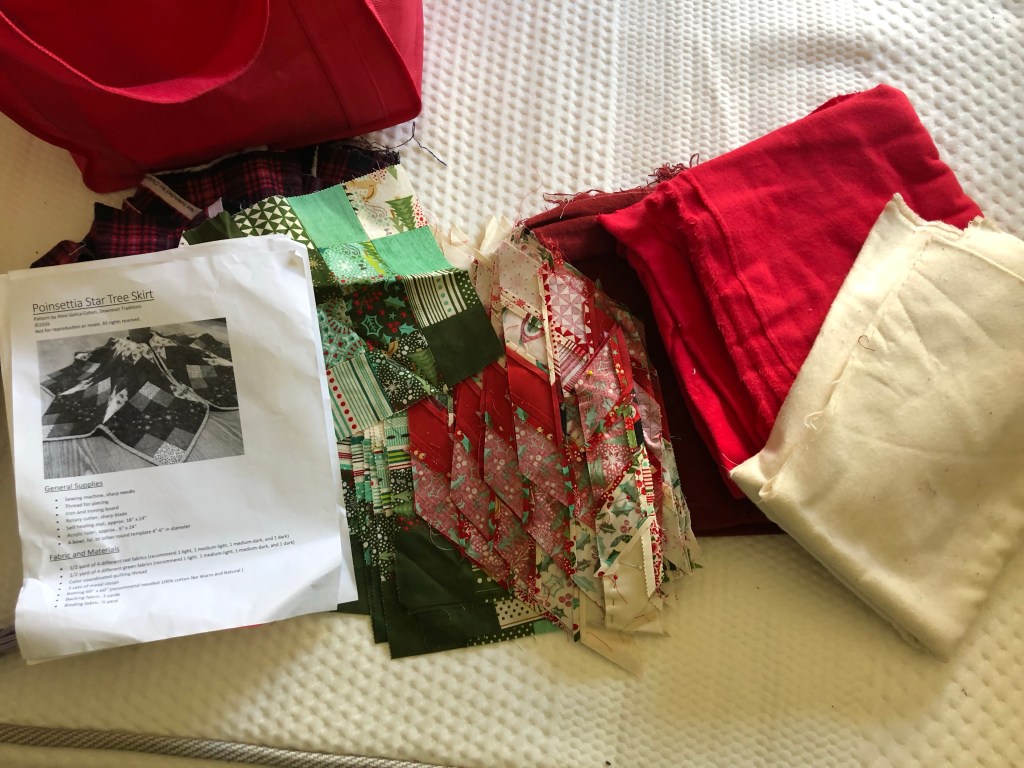 I have a fondness for tree skirts, although this is mostly rooted in my idyllic memory of my mom making the one that went around the Christmas tree for my entire childhood. I found a pattern online that appealed to me, a quilted star in reds, whites, and greens. I thought I was being so smart by using a fabric jelly roll where all the fabric was already cut into strips, but was promptly rewarded for my hubris when the strips proved too narrow for the larger pieces.