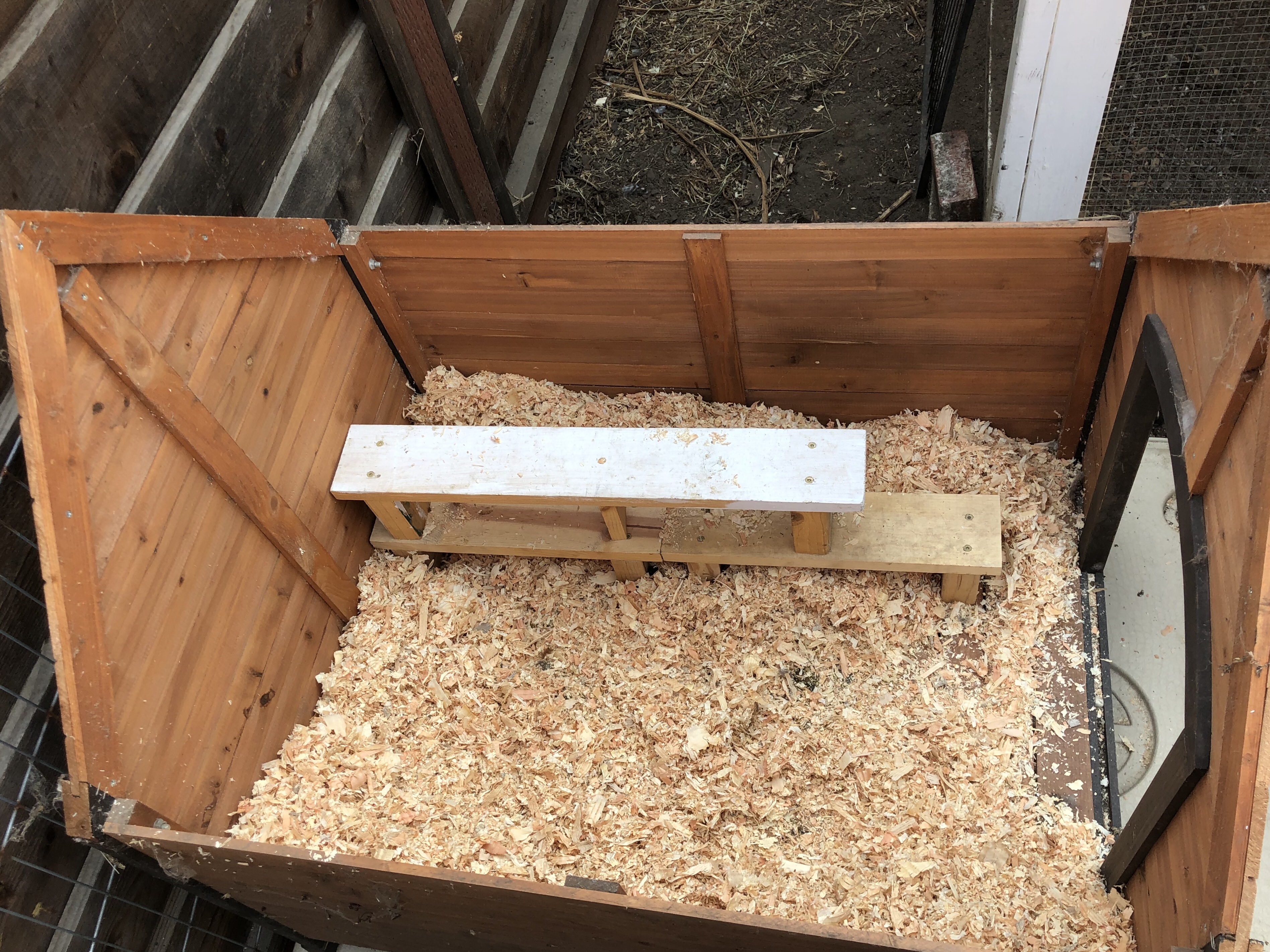 First hang up: I need to find a tiny coop – my space is cramped and oddly shaped. My mom comes to the rescue with a great idea: the DOG HOUSE. In days of yore, our dog would use it when he was in a dog run during the day. No longer! Now His Majesty does not deign to use such plebeian accommodations as a dog house. All it needs is a door, and it should work well for my six little visitors’ stay.