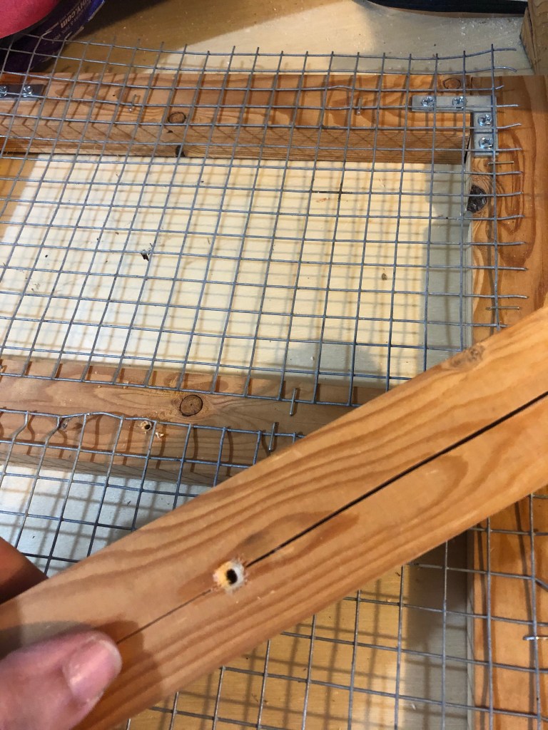 To make sure the hardware cloth wouldn’t get ripped out by some hulk raccoon, I add another layer of 1×2 to the back of the door. However, I forgot that hardwood is, well, hard. As soon as I try to screw the pieces onto the back of the door over the hardware cloth, they split. Badly.