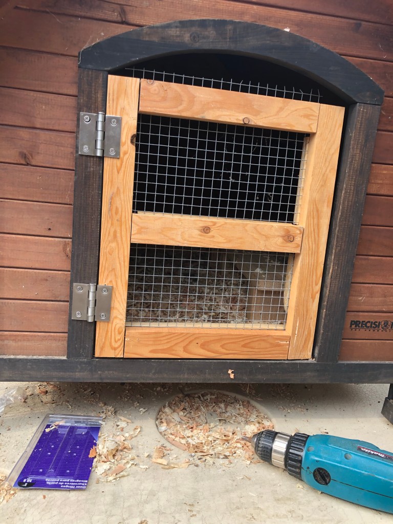 Once the door is more or less assembled, it’s time to hang it on the coophouse. I bought hinges with removable pins because I loathe hanging doors and any raccoon that has the savvy to get both pins out deserves his chicken dinner. I check the alignment about 600 times, still drill the holes for the screws in the wrong place, and attach those puppies securely. The door is IN!!
