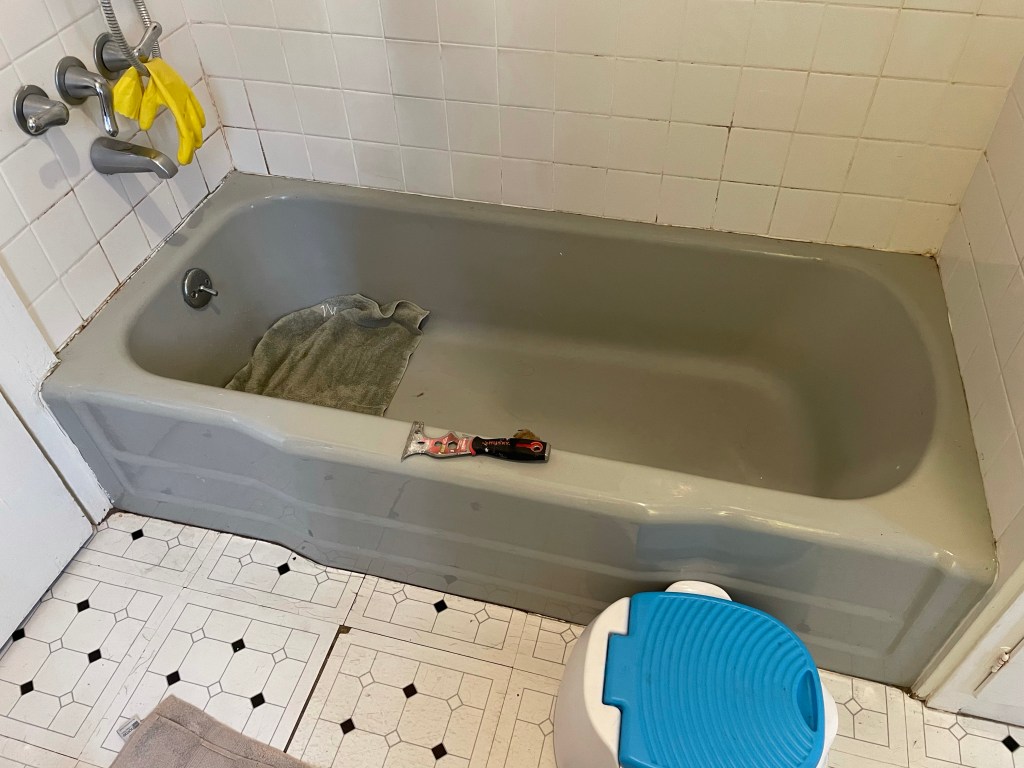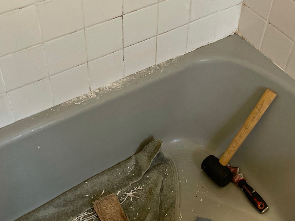 After having a little pity party for myself (it’s my party, I’ll cry if I want to), I go find my mallet and begin the slog of tapping out the grout. My scrape-y multitool puts dents in my mallet, so I tell my mallet sorry but needs must, and keep going. By the time I finally get around the entire tub rim, I’m ready to renounce bathing entirely.