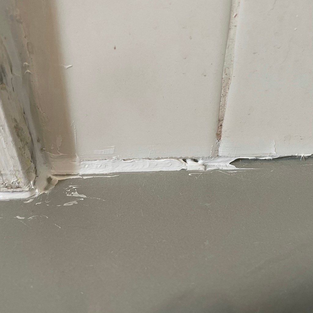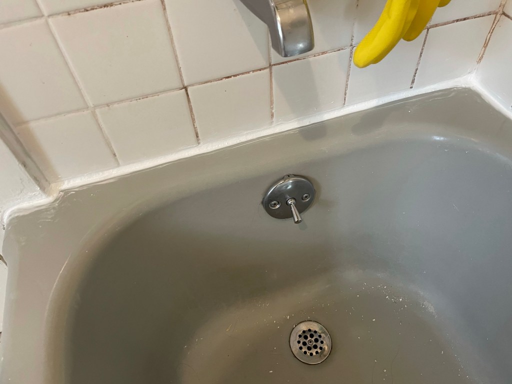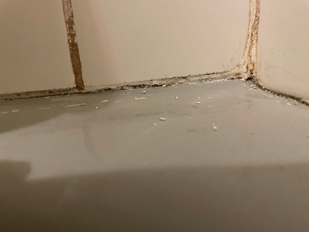 It took another more aggressive application (read: absurdly large bead) to finally get the gaps filled in. By this time, my patience and perfectionism had waned considerably, so my neatening up of the edges was… less than stellar. However, I am proud to say: no water is now getting through that seal. And when I’m showering or bathing my children, I no longer am plagued by fear of the joists rotting away around me. Instead, I just stare at that god-awful mildewed grout and think: I wonder if there’s an industrial chemical I can use to get that out and how long will my family have to wait to enter the house after I use it?