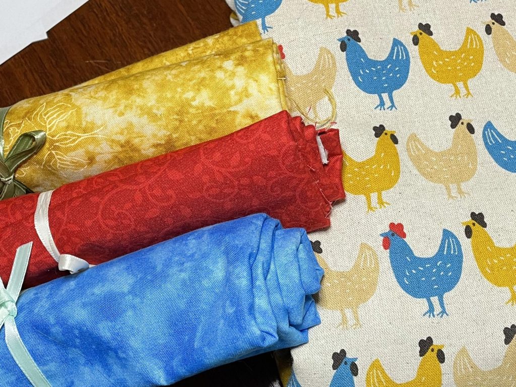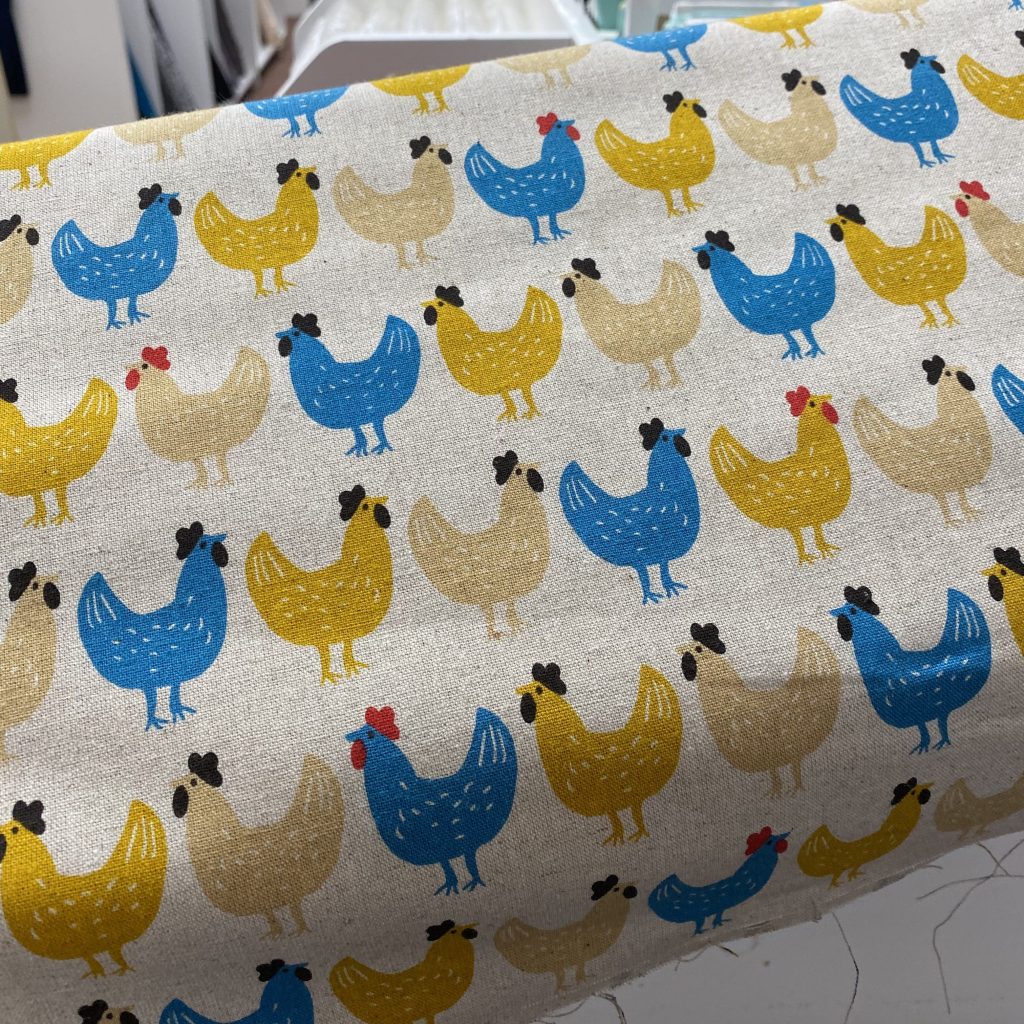 Chickens? Check. Colors I enjoy? Check. Delectably textured light canvas? Check and check. She gets me two yards and I start perusing possible uses. A dress? An apron? A bag. And I would have leftover fabric for other things too. AN ALL CHICKEN ENSEMBLE? You can’t contain this genius. I even found the perfect coordinating fabrics for the lining!