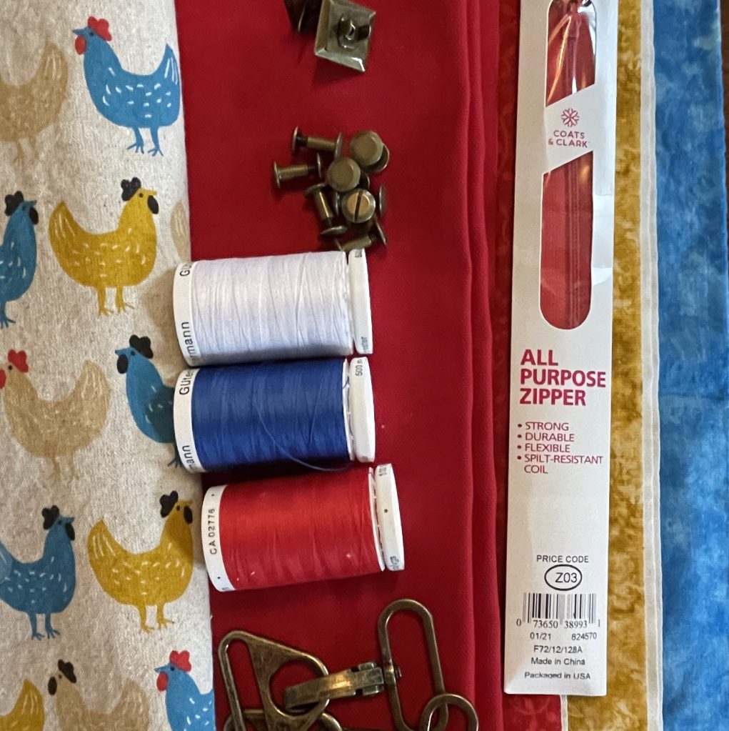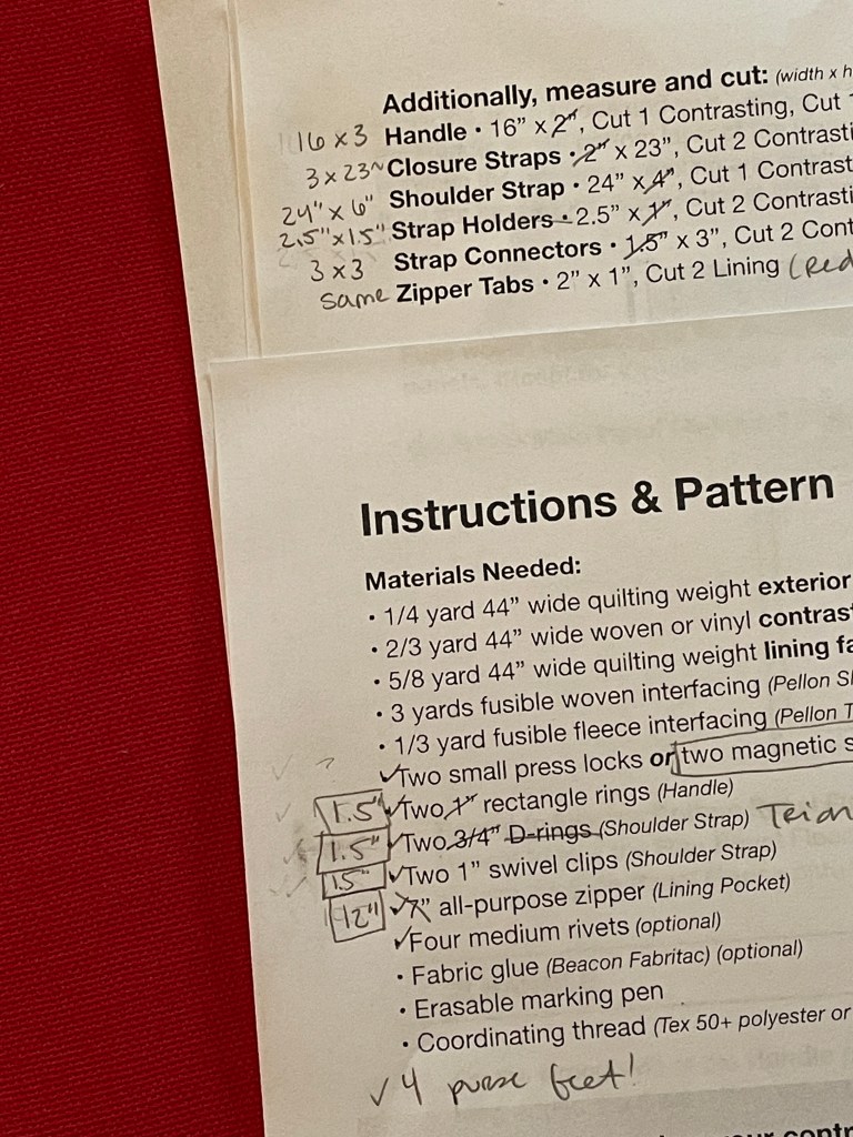 Now, finally, all fabrics are prepped and ready. The shipments of hardware have arrived. The pattern pieces are printed, cut, and assembled, and the pattern instructions are marked in the places I’m sure I’ll need to adjust dimensions to fit the enlarged size. Everything is set to start cutting out the pattern and piecing this bag in the morning!