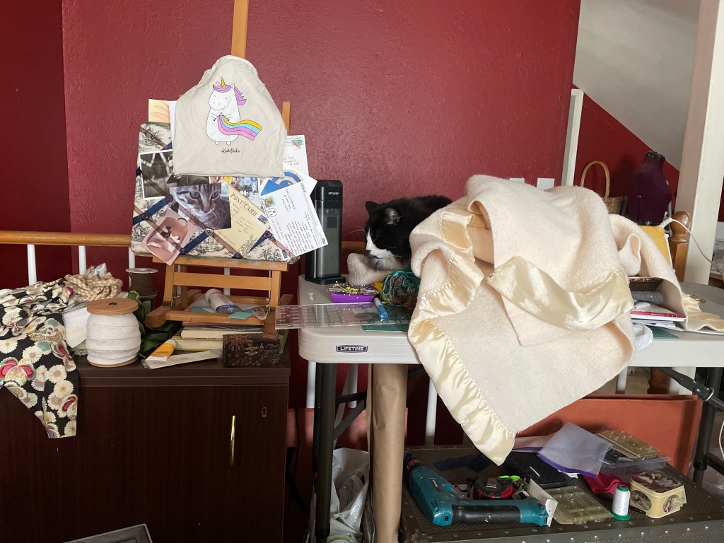 That said, I still prefer to do most creative work in my attic; a space more or less dedicated to that purpose, but that isn’t the only purpose of that space. My attic has many roles: guest bedroom, office space, supply closet, cat playground. In addition to my sewing machine, cutting table, crafting library, and the majority of my creative supplies, it also contains a bed, several holidays’ worth of decorations, cat boxes, and occasionally, a toilet paper fortress.